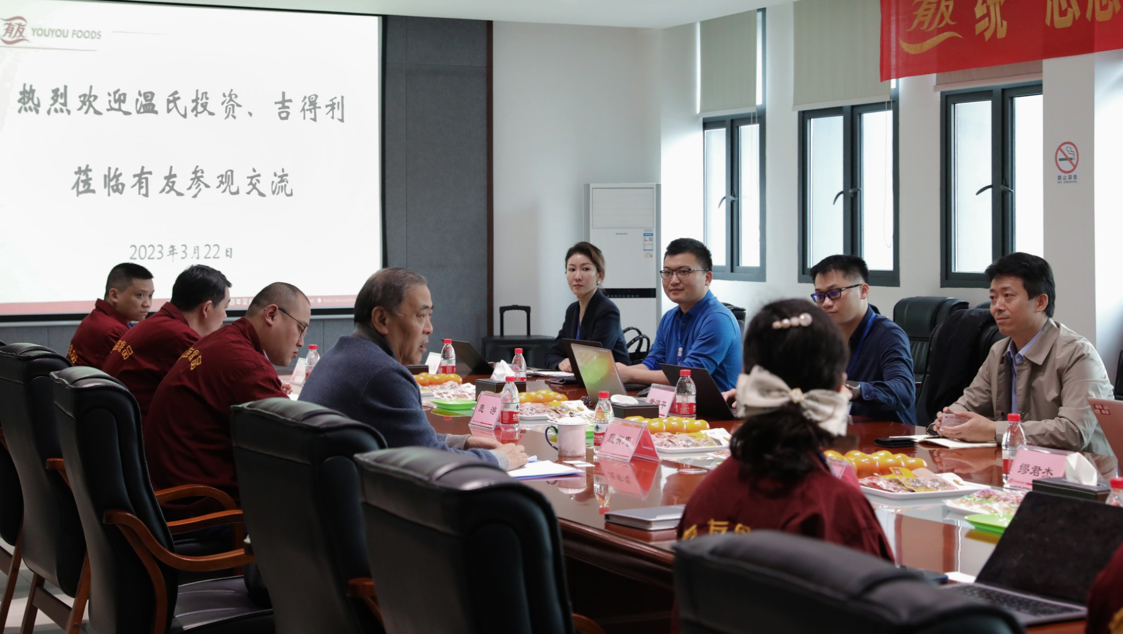 2022年,有友食品出资2000万元与温氏投资等共同投资温润佳品贰号(珠海)股权投资基金合伙企业(有限合伙),助力有友食品探索新赛道、布局新领域,进一步挖掘第二增长曲线,提升综合竞争力。温氏投资作为基金管理人,此次携温润佳品贰号基金投资企业吉得利走进有友食品,围绕市场、产业、物流、业务、技术等方面友好交流,深入探讨企业发展方向,推动友好合作。
